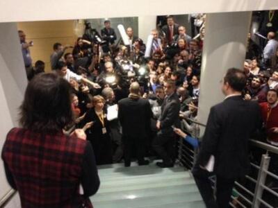 Η φωτογραφία αποδεικνύει το έντονο δημοσιογραφικό ενδιαφέρον από ΜΜΕ από όλο τον κόσμο για τις δηλώσεις του Έλληνα υπουργού και την προσπάθεια τους να βρεθούν κοντά του για να μπορέσουν να κάνουν κάποια ερώτηση.