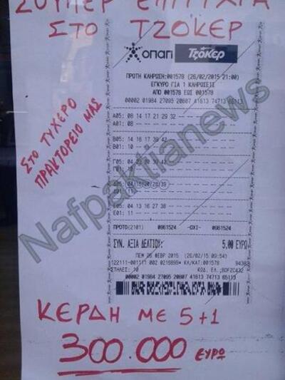 Αυτά είναι τα χρήματα που κέρδισε από το τυχερό δελτίο των 5 ευρώ,που παίχτηκε στο πρακτορείο των αδελφών Αναγνωστόπουλου στο κέντρο της Ναυπάκτου.