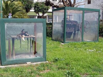 Πιο κάτω υπάρχει η σπασμένη προθήκη μηχανημάτων του παρελθόντος με τετράποδους φιλοξενούμενους .