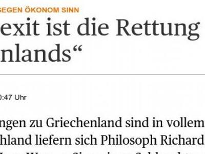 Από την άλλη πλευρά η γερμανική Handelsblatt σημειώνει πως το Grexit είναι η διάσωση της Ελλάδας και παραθέτει τη συζήτηση του προέδρου του Ινστιτούτο Ifo, Hans Wenner Sinn και του φιλοσόφου, Richard David Precht, οι οποίοι θέτουν επί τάπητος το θέμα.