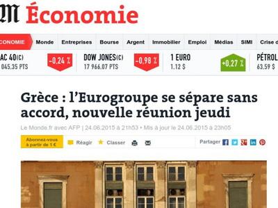 Το Eurogroup διεκόπη χωρίς συμφωνία αναφέρει η γαλλική Le Monde. «Η έκβαση της συνάντησης την Τετάρτη ήταν προβλέψιμη», τονίζει. Πριν ακόμη αυτό ξεκινήσει ο Γερμανός υπουργός Οικονομικών Β. Σόιμπλε είχε υπογραμμίσει ότι το επίπεδο προετοιμασίας στις διαπραγματεύσεις δεν τον κάνει αισιόδοξο και πως θα μπορούσε να έχει επιτευχθεί μια συμφωνία σήμερα, δήλωσε.