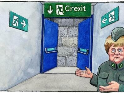Ντυμένη στο χακί (με ό,τι συνειρμούς μπορεί να παράξει μια τέτοια εικόνα) εμφανίζει ο Guardian την Μέρκελ, να δείχνει την πόρτα της εξόδου από την Ευρωζώνη, στην Ελλάδα.