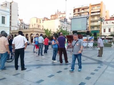 - Αυτή τη στιγμή στην πλατεία Γεωργίου δεν έχει συγκεντρωθεί ακόμη κόσμος. Όμως ακούγονται αγωνιστικά τραγούδια από τα μεγάφωνα  και έχει στηθεί ένα πανί προβολής, προφανώς των αποτελεσμάτων.
