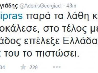 «Ο @atsipras παρά τα λάθη και την ζημιά που προκάλεσε, στο τέλος μεταξύ Σύριζα και Ελλάδος επέλεξε Ελλάδα. Η ιστορία αυτό θα του το πιστώσει», έγραψε ο κ. Γεωργιάδης.