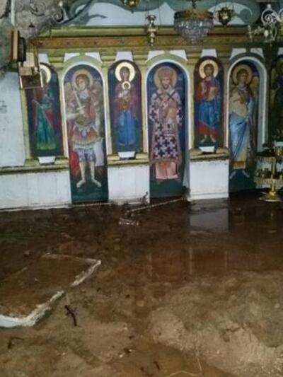 Τα πλακάκια στην εκκλησία όλα έξω, το Ιερό γεμάτο λάσπη, άνοιξαν τα παράθυρα και πέρασε από μέσα όλο το νερό πού ερχόταν από το αυλάκι της γέφυρας.