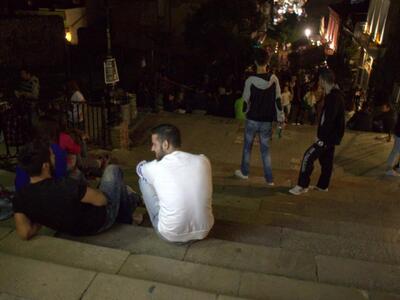Έτσι πίνουν τις μπύρες τους από το περίπτερο, κάνουν τα τσιγάρα τους, συζητούν, τραγουδούν, γίνονται όλοι μια παρέα και περνούν ευχάριστες στιγμές στις σκάλες, φυσικά με πολύ λίγα χρήματα…