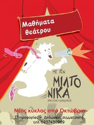 Η ομάδα «Σπινθήρας» διοργανώνει για 9η χρονιά ΜΑΘΗΜΑΤΑ ΘΕΑΤΡΟΥ με τον ηθοποιό και σκηνοθέτη Μίλτο Νίκα. Ένας νέος κύκλος φαντασίας ξεκινά κάθε Τετάρτη 6:30 μ.μ. - 9:30 μ.μ. Γνωρίστε το θέατρο συνόλου, τις βασικές αρχές υποκριτικής - κίνησης - λόγου 3 ώρες την εβδομάδα / 12 ώρες το μήνα πληροφορίες- δήλωση συμμετοχής στο τηλ. 6937430969