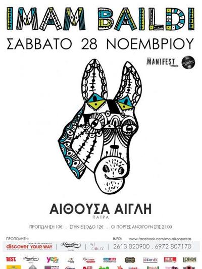 Μετά από τη πραγματικά καυτή sold out συναυλία τους πέρυσι τον Μαϊο στην Πάτρα και από μια καλοκαιρινή περιοδεία με δεκάδες σταθμούς, οι Imam Baildi επιστρέφουν για μια βραδιά στην πόλη της Πάτρας στην Αίθουσα Αίγλη στην Βέσο μάρε.