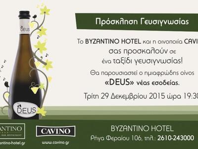 Το Ξενοδοχείο «Βυζαντινό» και η Οινοποιεία Cavino μας προσκαλούν την Τρίτη 29 Δεκεμβρίου στις 19.30 σε ένα ταξίδι γευσιγνωσίας όπου θα παρουσιαστεί ο ημιαφρώδης οίνος «Deus» νέας εσοδείας.