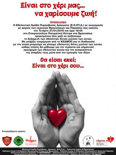 Στα Βραχναίικα οι εθελοντές πυροσβέστες της Εθελοντικής Ομάδας Πυρόσβεσης Διάσωσης Βραχναιίκων (Ε.Ο.ΠΥ.Δ.) πραγματοποιούν αυριο Τετάρτη στο Σταυροπούλειο, εκδήλωση προκειμένου να ευαισθητοποιήσουν τον κόσμο να γίνουν δωρητές μυελού των οστών.