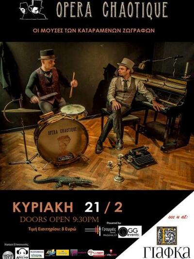 Πρόκειται για ένα ταλαντούχο, εκκεντρικό ντουέτο με αναπάντεχα ανατρεπτικό χιούμορ, άκρως σουρεαλιστική φαντασία και εκρηκτικές μουσικές αλχημείες. Οι Opera Chaotique έχουν καταφέρει μέσα σε λιγότερο από τέσσερα χρόνια να χαρτογραφηθούν ως ένα απολύτως μοναδικό φαινόμενο του μουσικού στερεώματος. Το ιδιαίτερο αυτό δίδυμο που καταπατά επιδεικτικά τις διαχωριστικές γραμμές ανάμεσα στην όπερα, τη τζαζ, το καμπαρέ και την ποπ, δημιουργήθηκε το 2011 από τον Tenorman φωνή/αφήγηση και πιάνο και τον Voodoo Drummer στα ντραμς ξεχώρισε αμέσως για το ιδιαίτερο μουσικό στίγμα, τη μοναδική αισθητική και την σαρωτική σκηνική παρουσία τους.