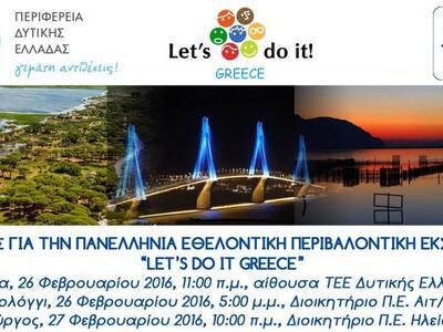 Παράλληλα, η Περιφέρεια Δυτικής Ελλάδας διοργανώνει σε συνεργασία με το Κέντρο Ευρωπαϊκής Πληροφόρησης «Europe Direct Πάτρας», ημερίδες για την εθελοντική εκστρατεία «Let’s do it Greece», σε κάθε μία από τις τρεις Περιφερειακές Ενότητες (Αχαΐα, Αιτωλοακαρνανία και Ηλεία).