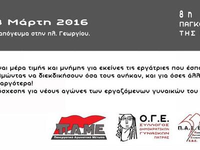 Το ΠΑΜΕ – Πανεργατικό Αγωνιστικό Μέτωπο, η ΟΓΕ – Σύλλογος Δημοκρατικών Γυναικών Πάτρα, η ΠΑΣΕΒΕ – Πανελλαδική Αντιμονοπωλιακή Συσπείρωση και το ΜΑΣ – Μέτωπο Αγώνα Σπουδαστών με αφορμή την 8η Μάρτη - Παγκόσμια Μέρα της Γυναίκας, οργανώνουν συγκέντρωση την Τρίτη 8 Μαρτίου 2016 στις 18:30 το απόγευμα στην πλατεία Γεωργίου, στην Πάτρα.