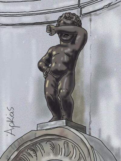 Το περίφημο Μάνεκεν Πις, «ο μικρός που κατουράει» των Βρυξελλών, δεν ανακουφίζεται πλέον ανέμελο. Το χέρι του είναι στα μάτια για να μην βλέπει τη φρίκη.