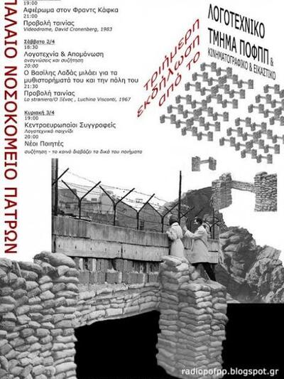 Το Λογοτεχνικό, το Κινηματογραφικό και το Εικαστικό Τμήμα των Πολιτιστικών Ομάδων των Φοιτητών του Πανεπιστημίου Πατρών - ΠΟΦΠΠ διοργανώνουν μια τριήμερη εκδήλωση στο χώρο του Παλαιού Δημοτικού Νοσοκομείου Πατρών (πλάγια είσοδος) στην άνω πόλη, από την Παρασκευή 1/4 έως την Κυριακή 3/4/2016.