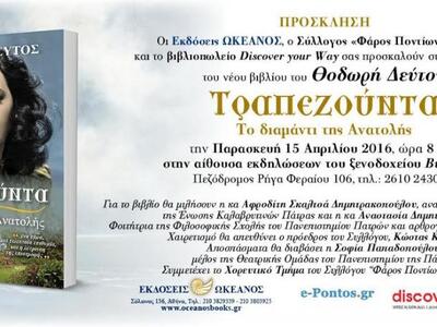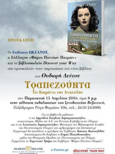 Το βιβλιοπωλείο Discover your Way, το οποίο βρίσκεται στην οδό Πατρέως, ο σύλλογος «Φάρος Ποντίων Πατρών» και οι εκδόσεις Ωκεανός συνδιοργανώνουν την εκδήλωση παρουσίασης του νέου βιβλίου του συγγραφέα Θοδωρή Δεύτου με τίτλο «Τραπεζούντα- Το διαμάντι της Ανατολής».