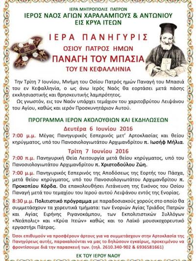 Την Τρίτη 7 Ιουνίου, Μνήμη του Οσίου Πατρός ημών Παναγή του Μπασιά του εν Κεφαλληνία, ο ως άνω Ιερός Ναός θα εορτάσει μετά πάσης εκκλησιαστικής και θρησκευτικής λαμπρότητος. Ως γνωστόν, εις τον Ναόν μας υπάρχει τεμάχιον του χαριτοβρύτου Λειψάνου του Αγίου, καθώς και ιερόν Προσκυνητάριον Αυτού.