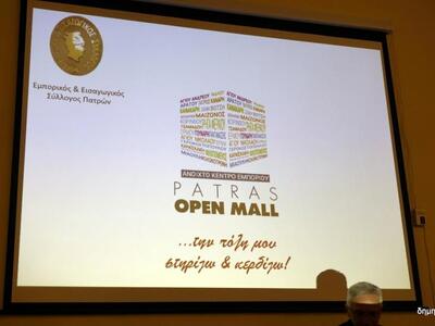 Παρουσίαση του Προέδρου της Ελληνικής Συνομοσπονδίας Εμπορίου και Επιχειρηματικότητας Βασίλη Κορκίδη εγκαινίαστηκε το πρωί το Open Mall της Πάτρας. Στο εγχείρημα συμμετέχουν 129 εμπορικές επιχειρήσεις του κέντρου, που θα προσπαθήσουν να προσελκύσουν τους καταναλωτές, με διάφορα δέλεαρ και προσφορές.