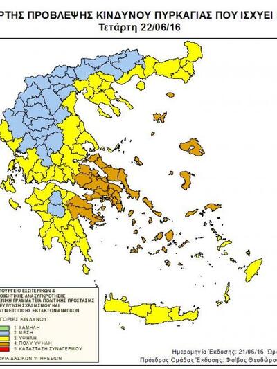 Υψηλό κίνδυνο πυρκαγιάς (κατηγορία κινδύνου 3) προβλέπει για την Τετάρτη 22 Ιουνίου η Γ.Γ. Πολιτικής Προστασίας σε διάφορες περιοχές της χώρας, μεταξύ αυτών ολόκληρη η Δυτική Ελλάδα, λόγω των υψηλών θερμοκρασιών και της ξηρασίας που επικρατούν στην περιοχή.Η Γενική Γραμματεία Πολιτικής Προστασίας (www.civilprotection.gr) του Υπουργείου Εσωτερικών & Διοικητικής Ανασυγκρότησης έχει ενημερώσει τις αρμόδιες υπηρεσιακά εμπλεκόμενες κρατικές υπηρεσίες, καθώς και τις Περιφέρειες και τους Δήμους των ανωτέρω περιοχών, ώστε να βρίσκονται σε αυξημένη ετοιμότητα πολιτικής προστασίας προκειμένου να αντιμετωπίσουν άμεσα τυχόν επεισόδια πυρκαγιών.