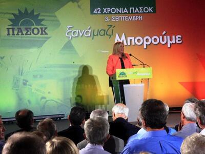 Στην Πάτρα σε πολιτική εκδήλωση για τη συμπλήρωση 42 χρόνων από την ίδρυση του ΠΑΣΟΚ και τη διακήρυξη της 3ης Σεπτέμβρη, μίλησε το βράδυ του Σαββάτου η πρόεδρος του κόμματος Φώτη Γεννηματά. Η κ. Γεννηματά έγινε δεκτή από τους οπαδούς και τους φίλους του κόμματος, που είχαν συγκεντρωθεί στα Παλαιά Σφαγεία στην Ακτή Δυμαίων με καπνογόνα και συνθήματα για το ΠΑΣΟΚ και τον ιδρυτή του Ανδρέα Παπανδρέου.