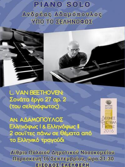 Όπως αναφέρει το σχετικό δελτίο Τύπου, θα είναι μία βραδιά με πανσέληνο, στην καρδιά ενός «ειρηνικού» μήνα με γλυκιά και μουσικοποιητική διάθεση. Η εκδήλωση θα περιλαμβάνει συναυλία piano solo, του συμπολίτη μουσικού και συνθέτη Ανδρέα Αδαμόπουλου, η οποία πραγματοποιείται στο πλαίσιο των εκδηλώσεων του Διεθνούς Φεστιβάλ της Πάτρας, με έναν αποκλειστικό πρωταγωνιστή επί σκηνής, το πιάνο.