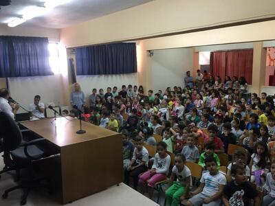 Εκεί τον περίμεναν οι λιλιπούτιοι μαθητές του 61ου και του 65ου Δημοτικού Σχολείου, οι οποίοι κυριολεκτικά τον αποθέωσαν κατά την είσοδο του στο Αμφιθέατρο.