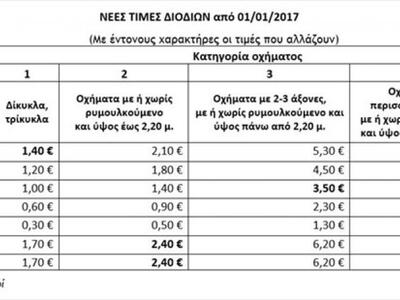 Σε αναπροσαρμογή των τελών διοδίων, με βάση των δείκτη τιμών καταναλωτή, προχωράει από την Κυριακή 1η Ιανουαρίου 2017 η Ολυμπία Οδός ΑΕ. Με την αναπροσαρμογή αυτή, προκύπτει μείωση 0,10€ σε όλους τους μετωπικούς σταθμούς διοδίων για τα φορτηγά, καθώς και στον πλευρικό σταθμό της Νέας Περάμου, στην κατηγορία των ΙΧ και μικρών φορτηγών στους σταθμούς Ζευγολατιού και Ρίου, καθώς και στην κατηγορία των δικύκλων και τρικύκλων στον σταθμό της Ελευσίνας.