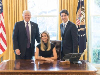 Η κόρη του Ντόναλντ Τραμπ πόζαρε δίπλα στον πατέρα της και τον Καναδό πρωθυπουργό, Τζάστιν Τριντό. Μόνο που εκείνη καθόταν ανάμεσά τους, στην καρέκλα του Αμερικανού προέδρου στο Οβάλ Γραφείο.