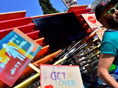 Ουρές κόσμου περιμένουν να βαφτούν με τα χρώματα του ουράνιου τόξου -σύμβολο της ΛΟΑΤΚΙ κοινότητας- με τη «ζωγραφική προσώπου» (face painting).