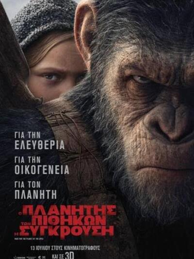 Ταυτόχρονα με την έξοδο της στις ΗΠΑ, θα δούμε στις ελληνικές αίθουσες από αυτή την Πέμπτη 13 Ιουλίου 2017 (και στην Πάτρα σε 5 αίθουσες των Στερ/Odeon και σε 3d) την ταινία «Ο Πλανήτης Των Πιθήκων: Η Σύγκρουση – War for the planet of the apes».