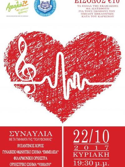 Μία μεγάλη συναυλία πραγματοποιεί ο Καλλιτεχνικός Οργανισμός της Πολυφωνικής Χορωδίας της Πάτρας, για τους σκοπούς του Ομίλου Εθελοντών κατά του καρκίνου ‘’ΑγκιαλιάΖω’’, την προσεχή Κυριακή 22 Οκτωβρίου 2017 στις 19.30 το απόγευμα, στο Συνεδριακό και Πολιτιστικό Κέντρο του Πανεπιστημίου Πατρών, στο Ρίο.
