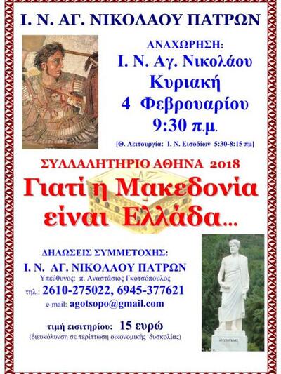 Κινητοποίηση έχει ξεκινήσει στην Πάτρα ενόψει του Συλλαλητηρίου για την Μακεδονία που θα γίνει την ερχόμενη Κυριακή 4 Φεβρουαρίου 2018 στις 14.00 το μεσημέρι στην πλατεία Συντάγματος στην Αθήνα, όπου όπως έγινε γνωστό θα προβληθεί και βιντεοσκοπημένο μήνυμα του μεγάλου μας συνθέτη Μίκη Θεοδωράκη.
