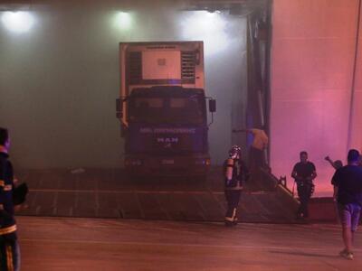 Οι οδηγοί των γερανών ή των οχημάτων μπαίνουν με αντιασφυξιογόνες μάσκες συνοδευόμενοι από πυροσβέστες προκειμένου να βγάλουν τα οχήματα.